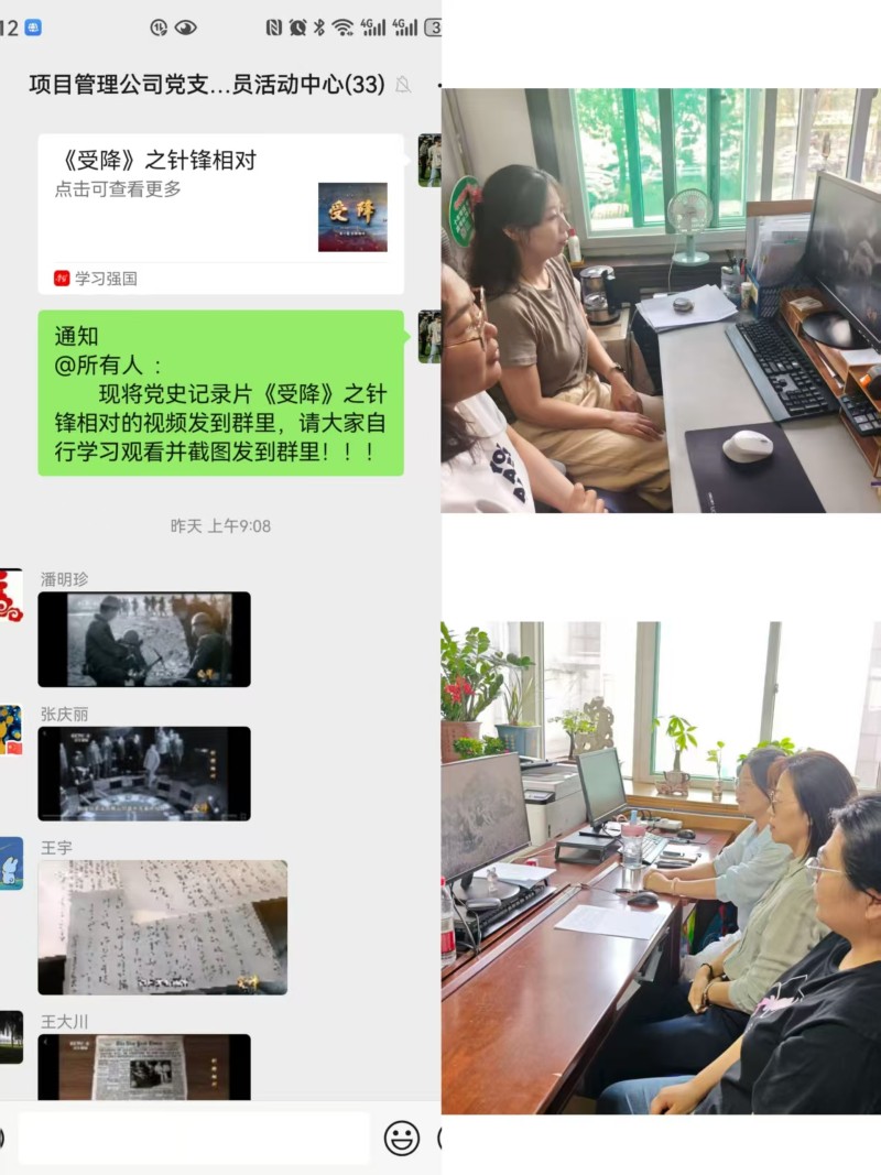 9月1日,項目管理公司黨支部開展“重溫歷史 奮勇爭先”主題活動?;顒又?,全體黨員干部共同觀看黨史紀錄片《受降》,紀錄片以詳實的史料、珍貴的影像生動展現(xiàn)中國共產(chǎn)黨始終以人民利益為根本,在復雜形勢下堅守信仰、運籌帷幄的政治智慧和使命擔當,引導黨員干部不斷加強黨史學習,切實把優(yōu)秀歷史經(jīng)驗轉(zhuǎn)化為推動工作的實際行動。