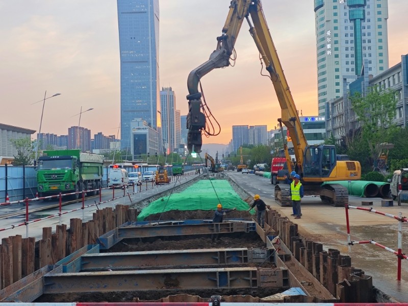 “追求精細極致,鑄就基坑支護的穩(wěn)固防線”。項目部將鋼板樁施打質(zhì)量視為確保基坑安全與質(zhì)量的關(guān)鍵環(huán)節(jié),嚴格執(zhí)行材料準入制度,所有進場鋼板樁均經(jīng)過材質(zhì)證明核查、尺寸精度測量和外觀質(zhì)量檢驗三重把關(guān),確保樁身無裂紋、無銹蝕等質(zhì)量缺陷,從源頭上杜絕不合格材料。施工中,施工人員采用全站儀進行動態(tài)監(jiān)測,嚴格控制樁身垂直度偏差在規(guī)定范圍內(nèi),詳細記錄每根樁的打入深度、貫入度等關(guān)鍵參數(shù)。拔樁階段采用專用施工設(shè)備,按照“先支后拆、分段拔除”的原則有序進行,拔樁后出現(xiàn)的孔隙立即灌砂,最大限度減少對周邊土體的擾動,實現(xiàn)平穩(wěn)施工與環(huán)境保護的和諧統(tǒng)一。